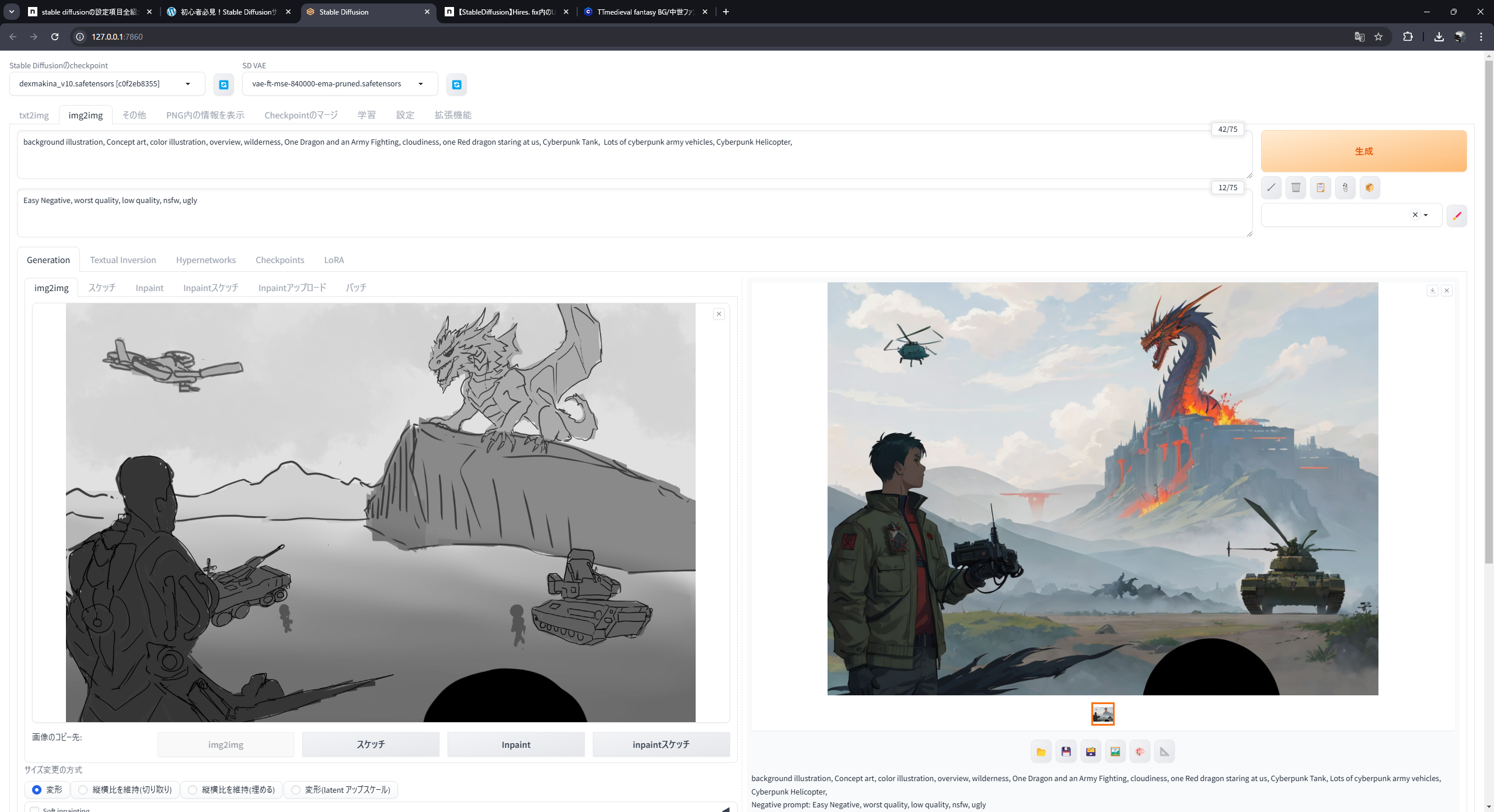 上記の要素を組み合わせ出力する事で2回に1回程度は希望通りの画像が生成されるようになった。