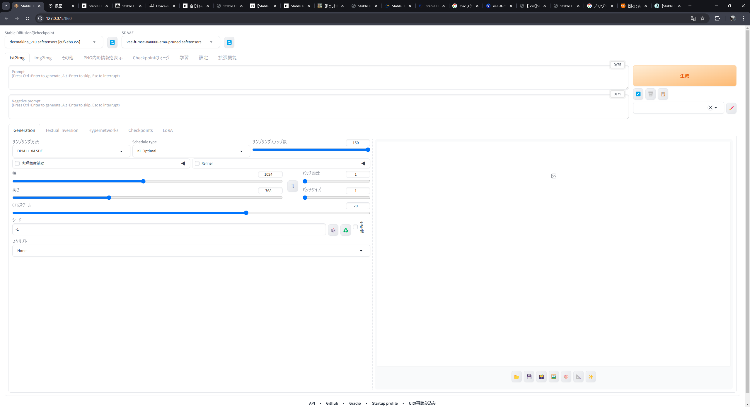これは実際の出力画面である。今回注目して欲しいのはサンプリング方法、その右のスケージュルタイプ、サンプリングステップ数、CFGスケールの4つの項目である。
